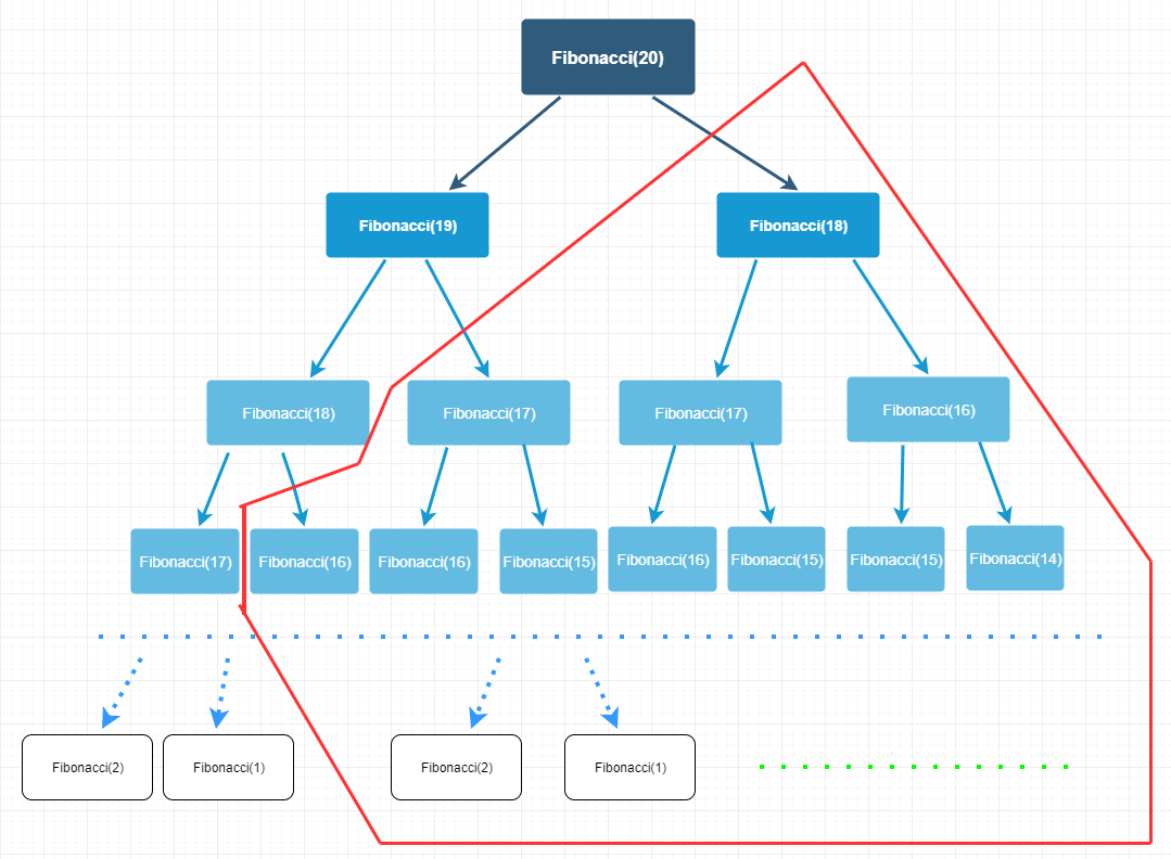 红色实线部分圈着的是被剪枝的节点,是不是剪掉了所有的重复树节点?没错是的,所有重复的子问题都被干掉了,时间复杂度骤减。 它时间复杂度也从 O(n^2)降低到了 O(n)
