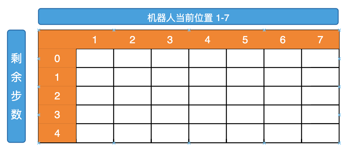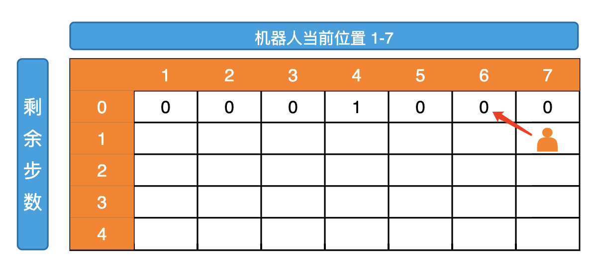 通过纯暴力的方式后,我们可知可变参数就两个,当前所在的位置(curPos)和剩余步数(restStep),curPos 的变化范围是 1-N,restStep 的变化范围是 0-K,根据两个可变参数我们绘制一个表格