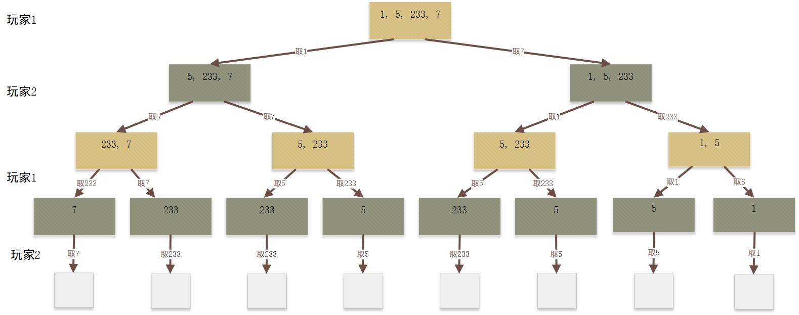 暴力递归分析过程:假设我先拿牌,则我可以拿左侧的牌或者拿右侧的牌,这时我会有两种方案,因为我绝顶聪明,我肯定获取两种方案中最大的那个,然后轮到对手拿牌,对手也可以选择拿左侧或者右侧的牌,不管对手拿哪个牌,只要牌数大于 1,则后续都会有我拿牌得到的分数,对手也决定聪明,肯定给我最小的值,分析代码如下: