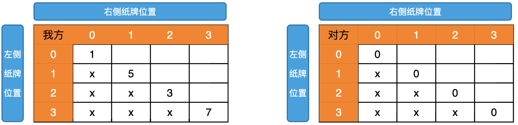 根据 baseCase 我们可以得到 L==R 上的两个动态规划表的值如下:
