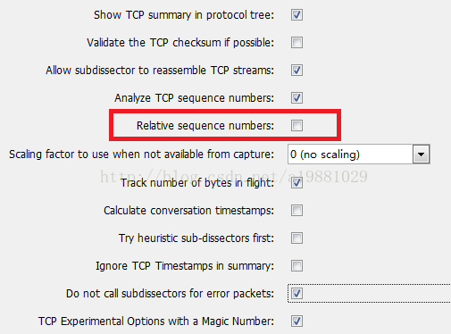 如果想要关闭相对序列号 / 确认号,可以选择 Wireshark 菜单栏中的 Edit -> Preferences ->protocols ->TCP,去掉 Relative sequence number 后面勾选框中的 √ 即可