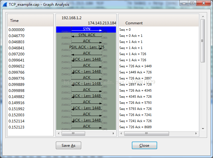 每行代表一个单独的 TCP 包,左边列显示时间,中间列显示包的方向、TCP 端口、段长度和设置的标志位,右边列以 10 进制的方式显示相关序列号 / 确认号,在这里选中任意行会高亮主窗口中该行所关联的包