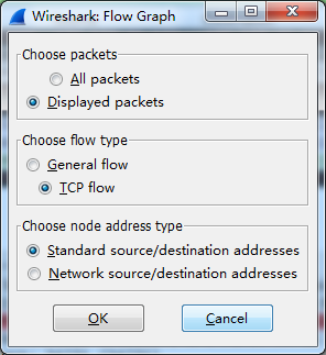 为了更好的理解在整个 TCP 会话期间,TCP 序列号和确认号是如何工作的,我们可以使用 Wireshark 内置的绘制流功能,选择菜单栏中的 Statistics ->Flow Graph...->TCP flow ->OK