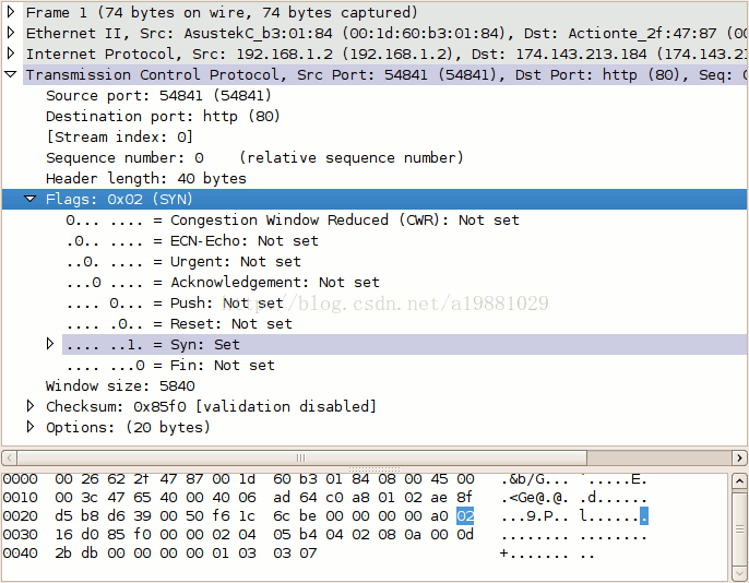 选择 Wireshark 中的 “包”1 并且展开中间面板的 TCP 层解析,然后展开 TCP 头中的标志位域,这里我们可以看见所有解析出来的 TCP 标志位,需要注意的是,“包 1” 设置了 SYN 标志位