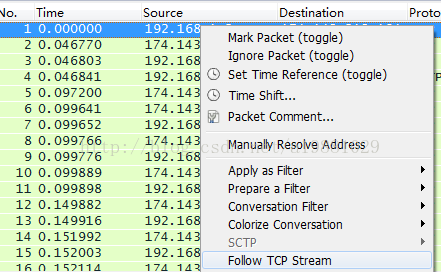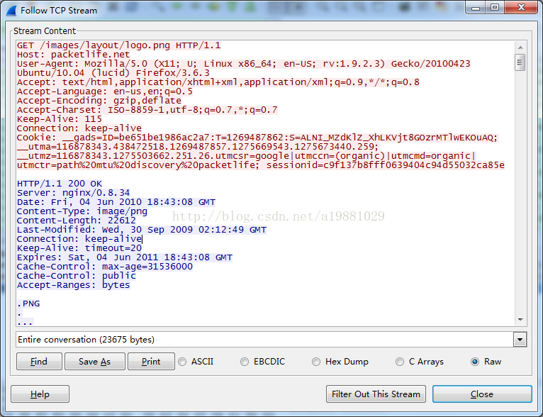 示例中仅包含一个单独的 HTTP 请求,请求的流程是:web 浏览器向 web 服务器请求一个单独的图片文件,服务器返回一个成功的响应(HTTP/1.1200 OK),响应中包含请求的文件。右键示例文件中任意一个 TCP 包并且选择 Follow TCP Stream 就可在单独的窗口查看原始的 TCP 流