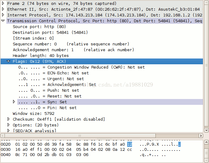 使用同样的方式操作 “包 2”。可以看到 "包 2" 设置了 2 个标志位:ACK - 用来确认收到客户端的 SYN 包,SYN - 用来表明服务端也希望建立 TCP 连接