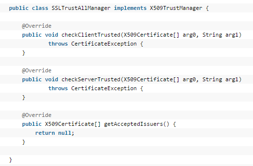 首先定义一个自己的 SSLTrustAllManager,其继承自 X509TrustManager,具体来说,用 SSLTrustAllManager 创建一个 SSLContext,然后用 SSLContext 生成一个 SSLSocketFactory,然后通过调用 HttpURLConnectoin 的 setSSLSocketFactory 方法将其给某个具体的连接对象使用。由于 SSLTrustAllManager 没有对其中的三个核心方法进行具体实现,也就是不对证书做任何审查。这样无论服务器的证书如何,都能建立 HTTPS 连接,因为客户端直接忽略了验证服务器证书这一步。