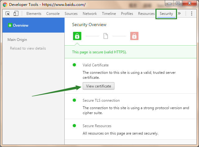 - 这是会打开 Chrome 的 Developer Tool,并自动切换到 Security 这个页面。
