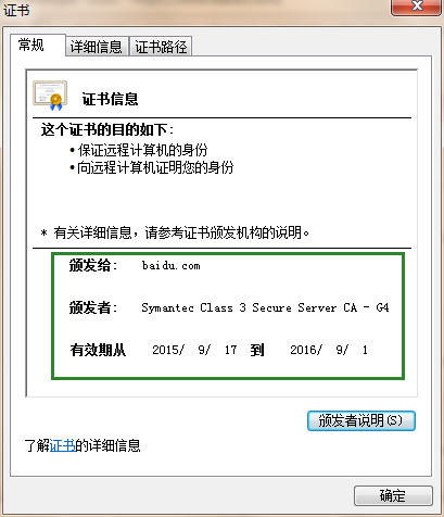 在 “常规” 这个面板中,我们从中可以查看该证书是又 Symantec 颁发给 baidu.com 这个网站的,有效期是从 2015 年 9 月 17 到 2016 年 9 月 1 日。
