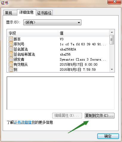 上面有个 “复制到文件” 的按钮,点击该按钮就可以将百度的数字证书导出成文件,从而我们就可以保存到自己的机器上,界面如下所示: