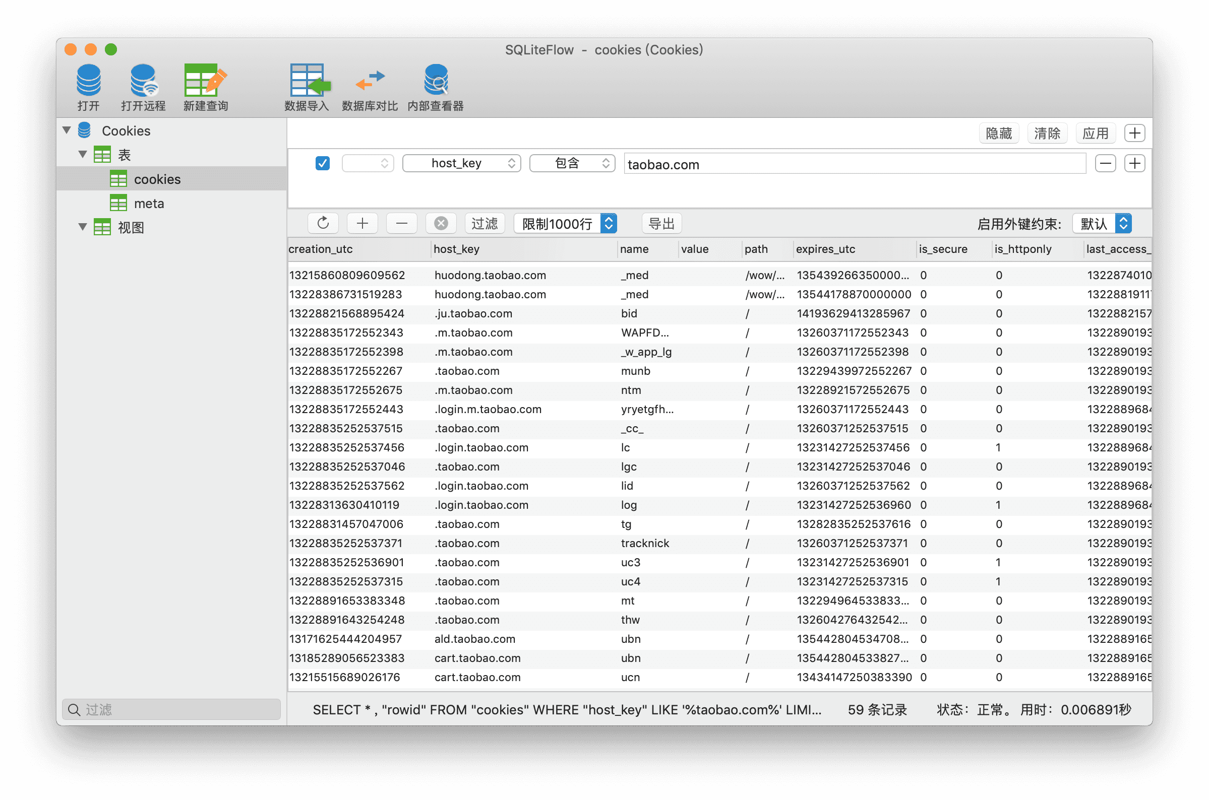 尽管我们在浏览器里查看到了 Cookie,这并不意味着 Cookie 文件只是存放在浏览器里的。实际上,Cookies 相关的内容还可以存在本地文件里,就比如说 Mac 下的 Chrome,存放目录就是 ~/Library/Application Support/Google/Chrome/Default,里面会有一个名为 Cookies 的数据库文件,你可以使用 sqlite 软件打开它: