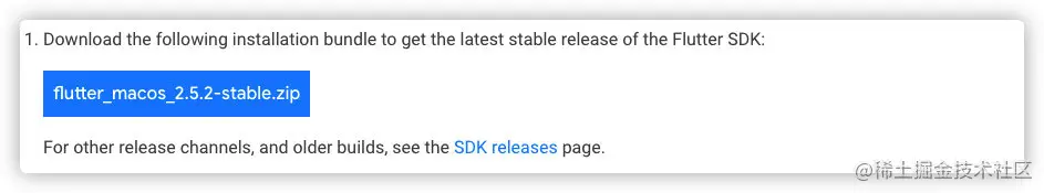 最新的版本为:flutter_macos_2.5.2-stable.zip,stable意为稳定的,当然,也可以下载指定版本下载地址
