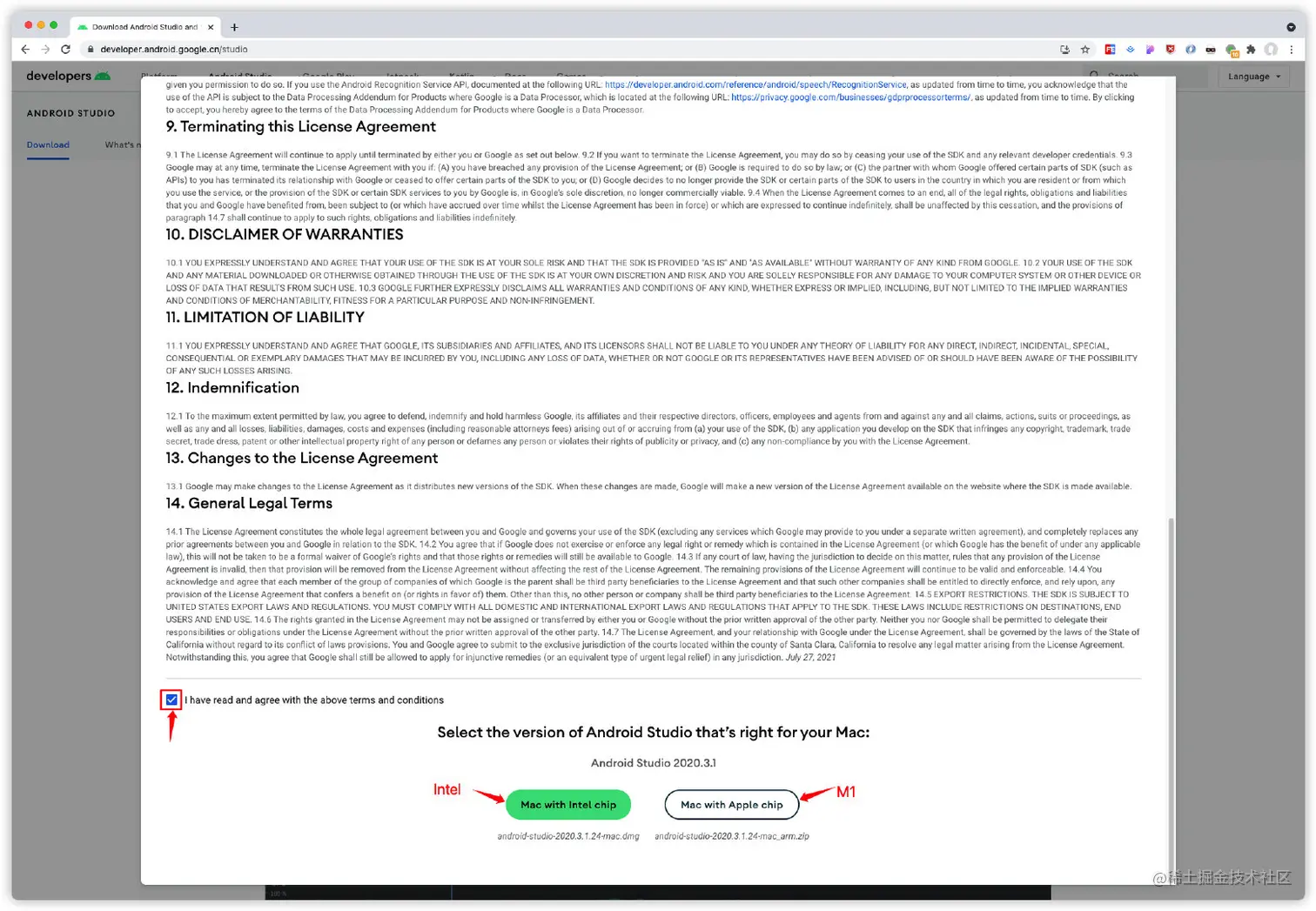 点击前往下载界面,勾选条款之后,此处有两个下载按钮,分别针对Mac的两种芯片intel和M1,请根据电脑芯片下载: