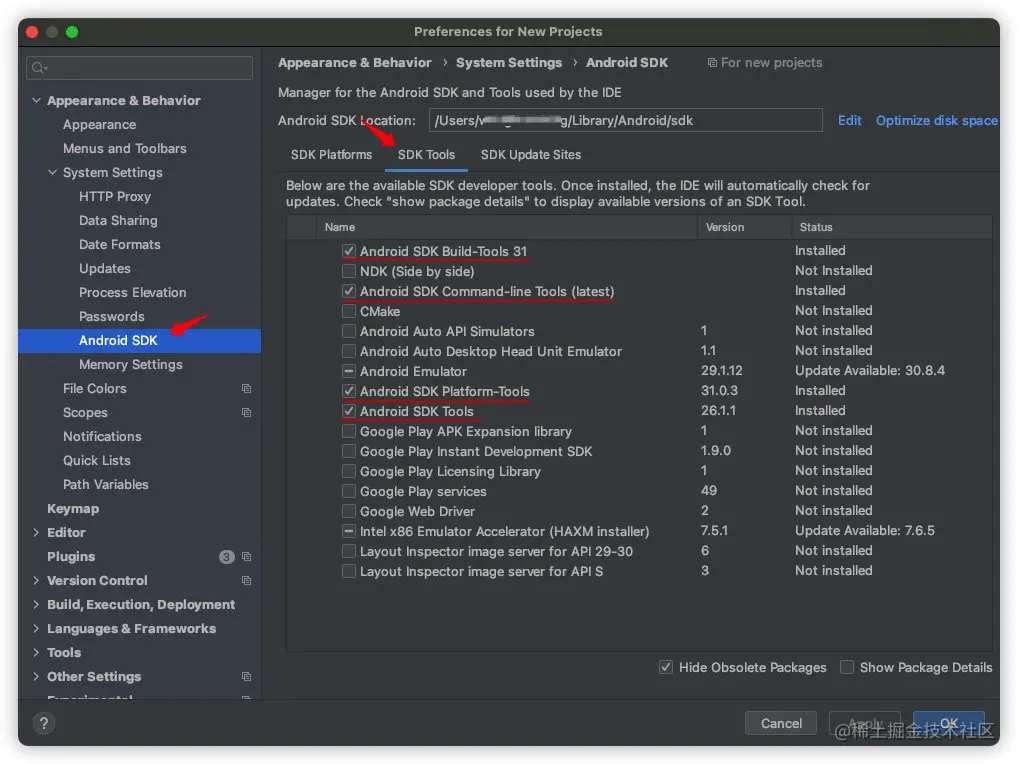 如果之前安装过Android Studio,那么可以前往偏好设置(快捷键cmd+,)进行SDK的安装: