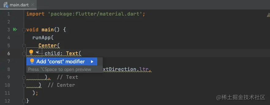 加上const之后,Center将会变成一个常量,因为目前Center组件不会动态改变,那么Flutter将会推荐将其定义为const;