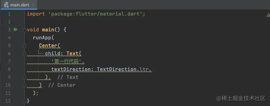 在此之前,我们已经运行成功Flutter的示例工程,在main.dart文件中默认生成了很多代码,这个时候,这些代码我们是看不大明白的,所以我们从零开始学习Flutter组件,将main.dart文件清空,我们自己来写界面,一步步熟悉Flutter界面的搭建流程;