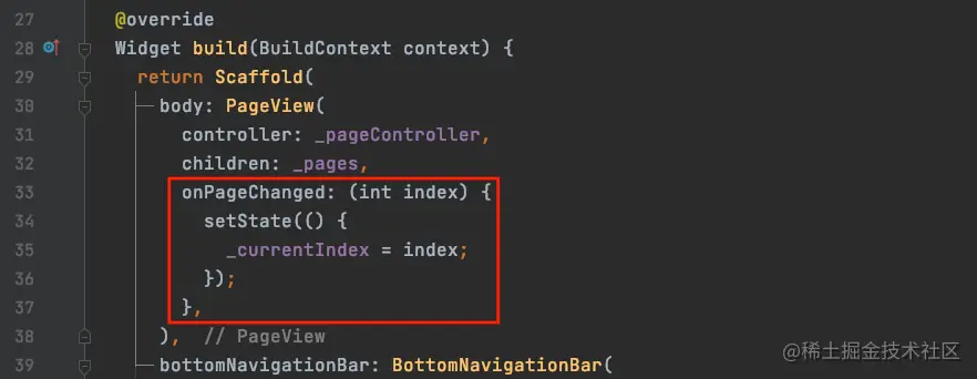 我们使用了PageController和PageView之后,页面具备了滑动切换的功能,但是滑动时,底部的状态平没有随着切换;所以在页面改变时,我们还需要同步改变选中的索引,也就是_currentIndex: