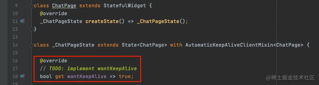 我们可以看到,此时_ChatPageState爆出错误;这是因为实现混入功能,我们需要重写wantKeepAlive,代码如下: