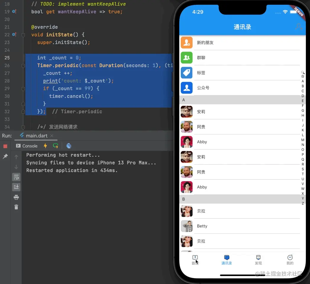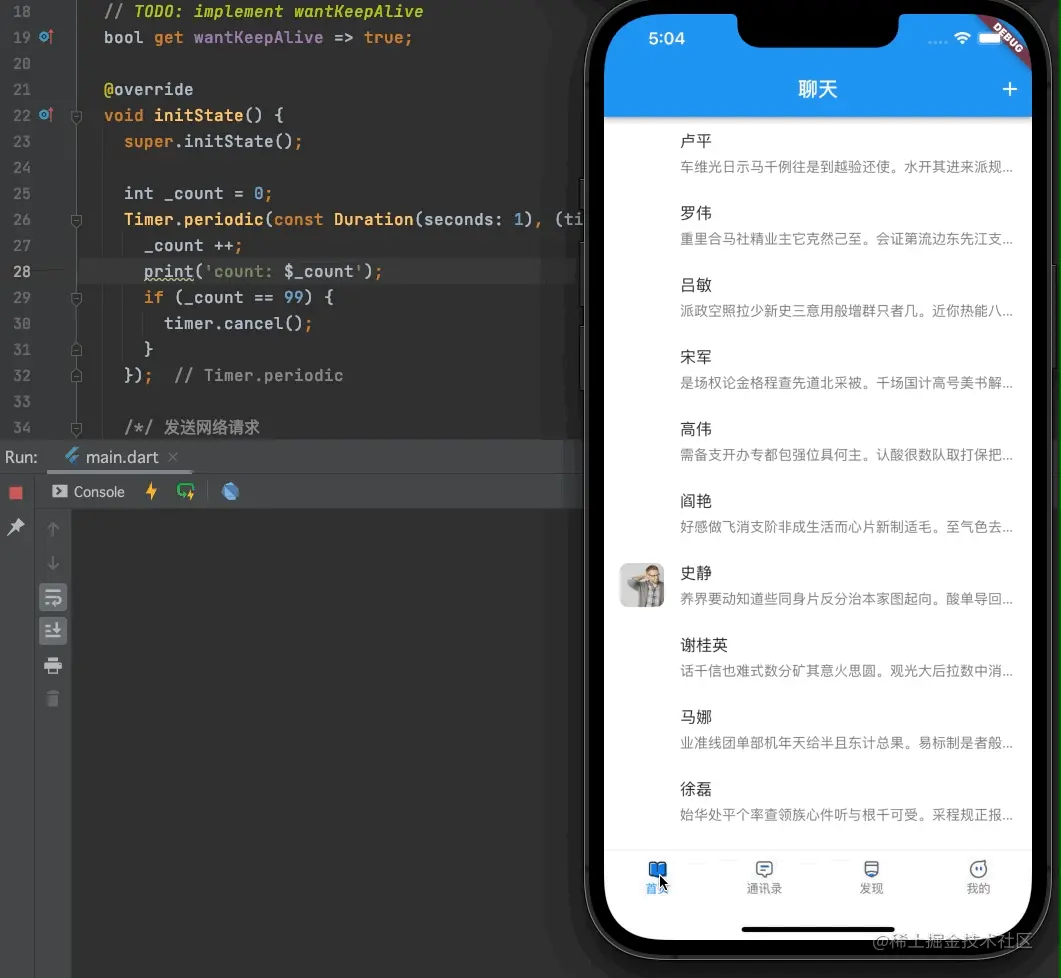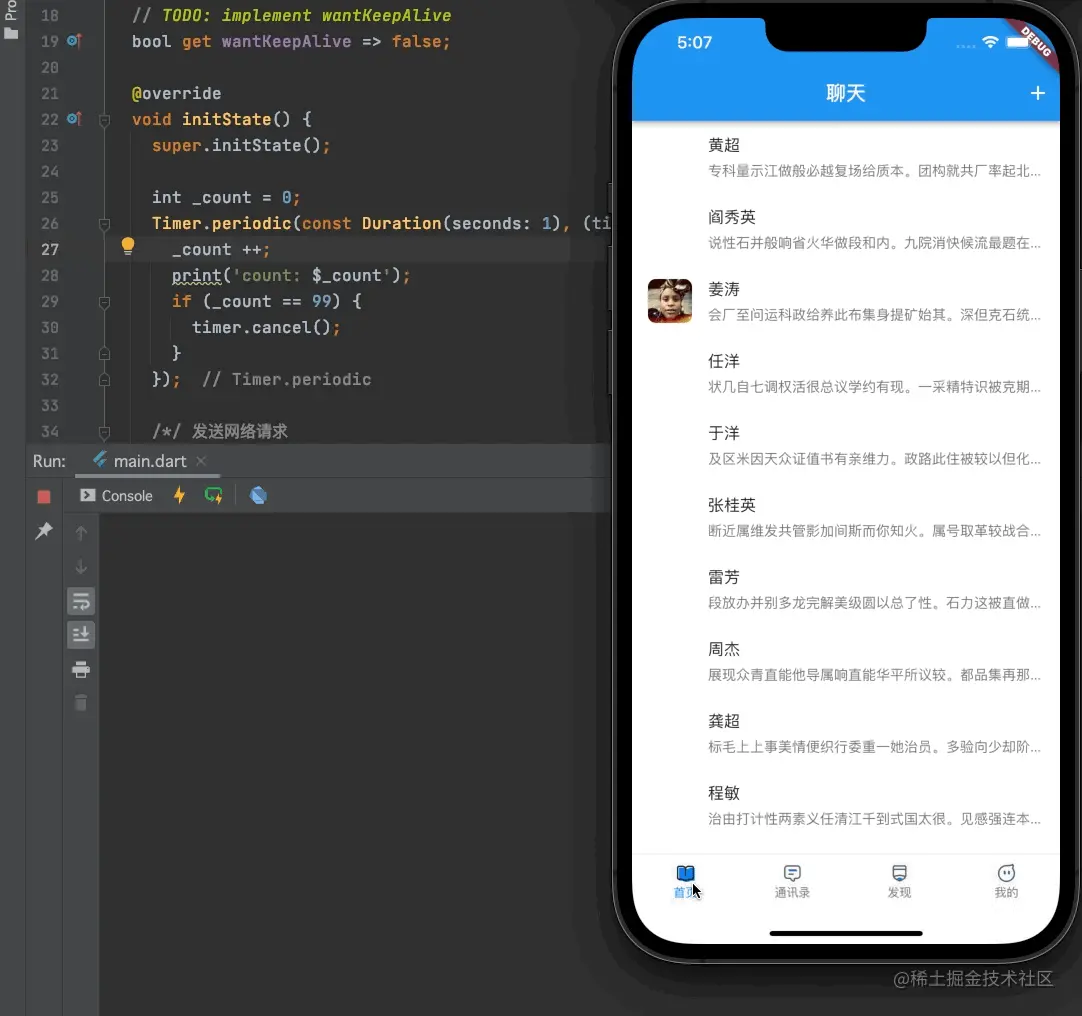 这样的话,如果我们的wantKeepAlive = false,那么每次页面切换出去的时候Timer都会被销毁,返回页面之后将会重新创建一个Timer;如果wantKeepAlive = true,那么页面切换出去之后,因为状态保留了,所以dispose并不会执行,也不会进行Timer的销毁操作,页面再次出现时,也不会出现第二次创建Timer的情况;