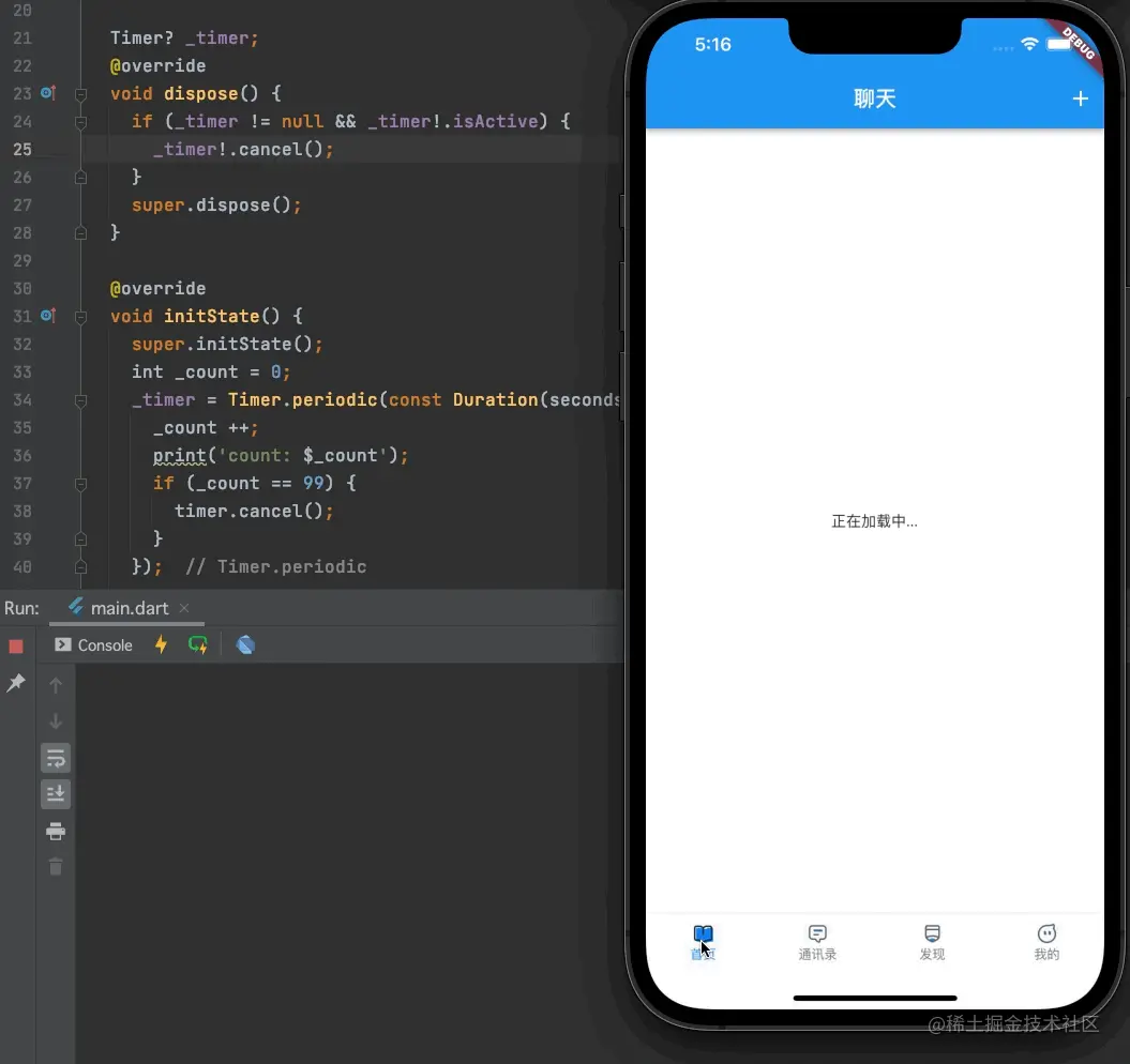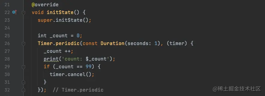 我们在initState方法中添加一个Timer定时器,每1秒执行一次,_count每次加1,当_count值为99的时候,我们将定时器销毁cancel();