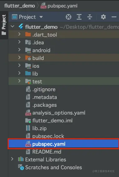 我们创建一个新的Flutter工程,其配置文件pubspec.yaml文件就位于根目录,如下图所示: