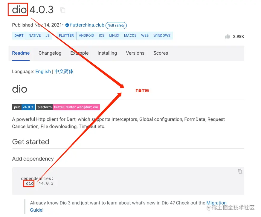 Flutter插件并对外发布,那么在pub.dev网站上,此属性将会作为标题显示,他人使用此插件时,引入也需要使用到此属性;