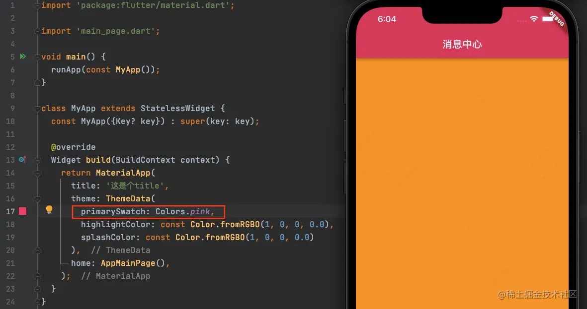 想要修改导航栏背景色,需要设置MaterialApp中theme的primarySwatch属性: