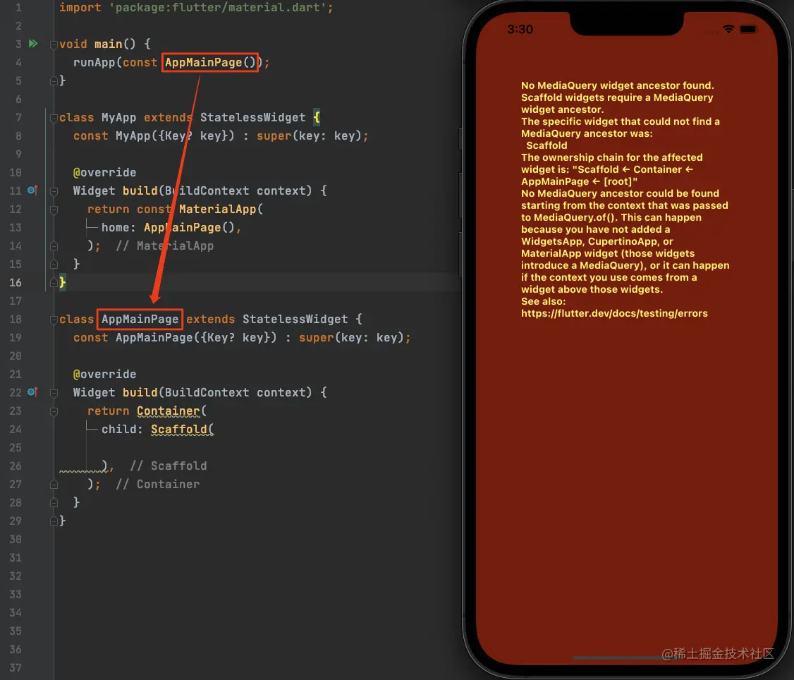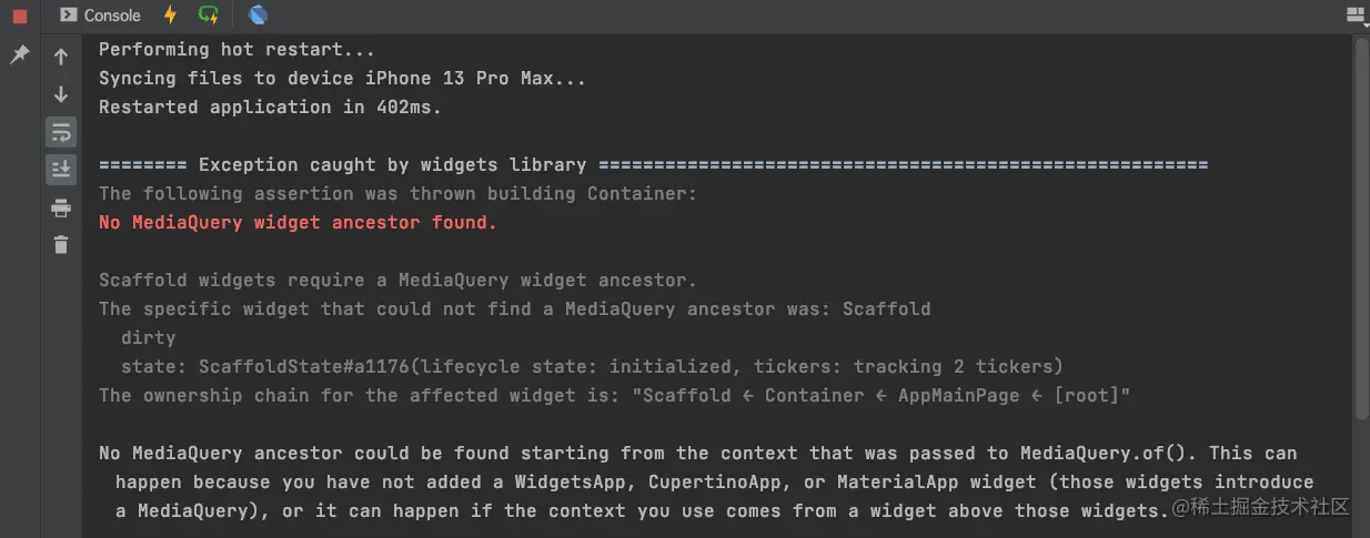 可以看到,Scaffold脱离MaterialApp单独使用就会报错: