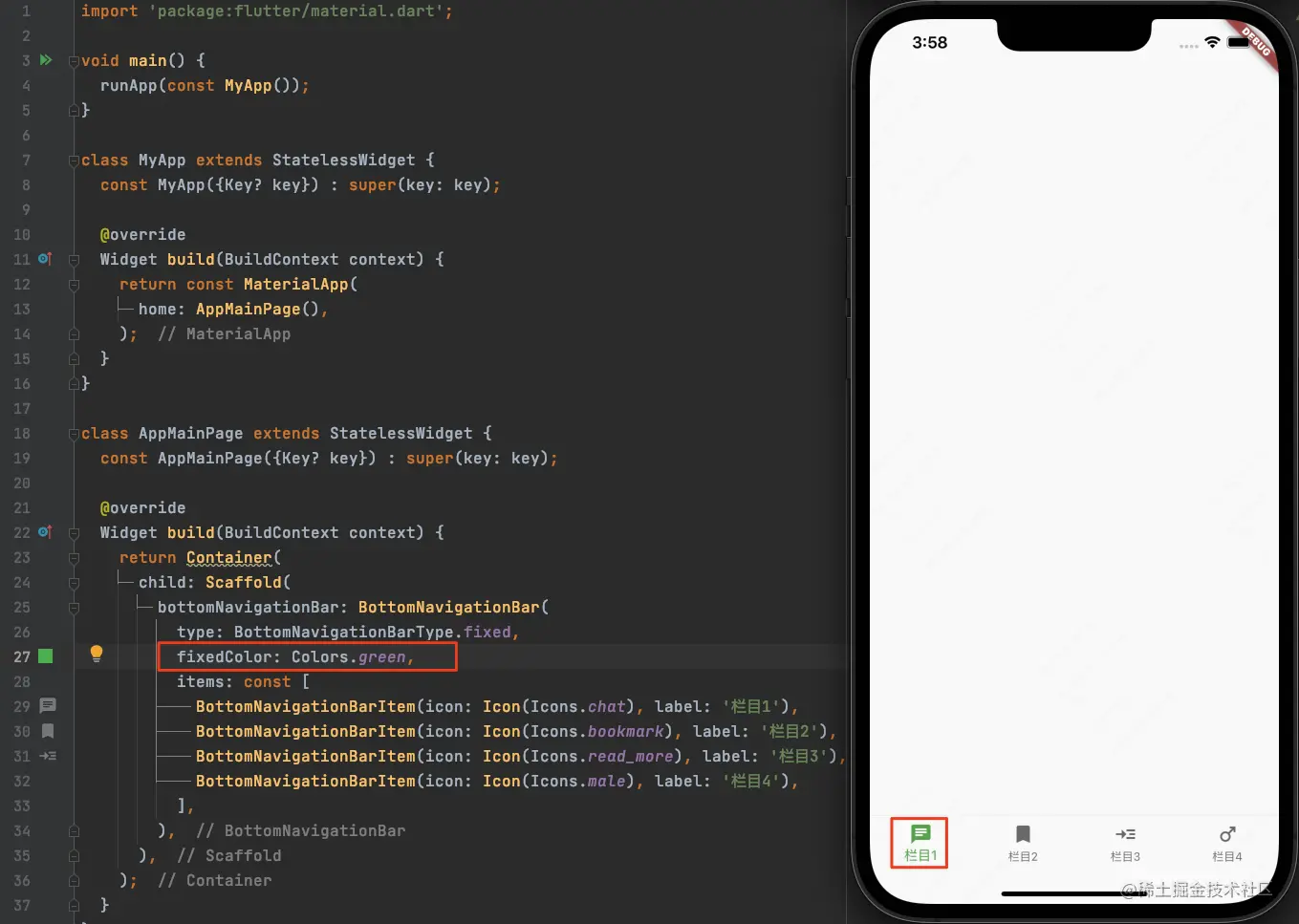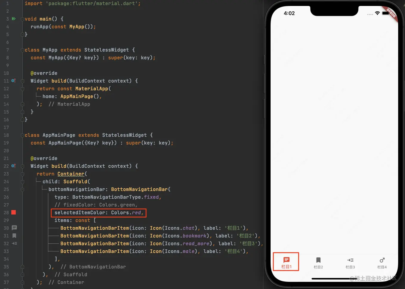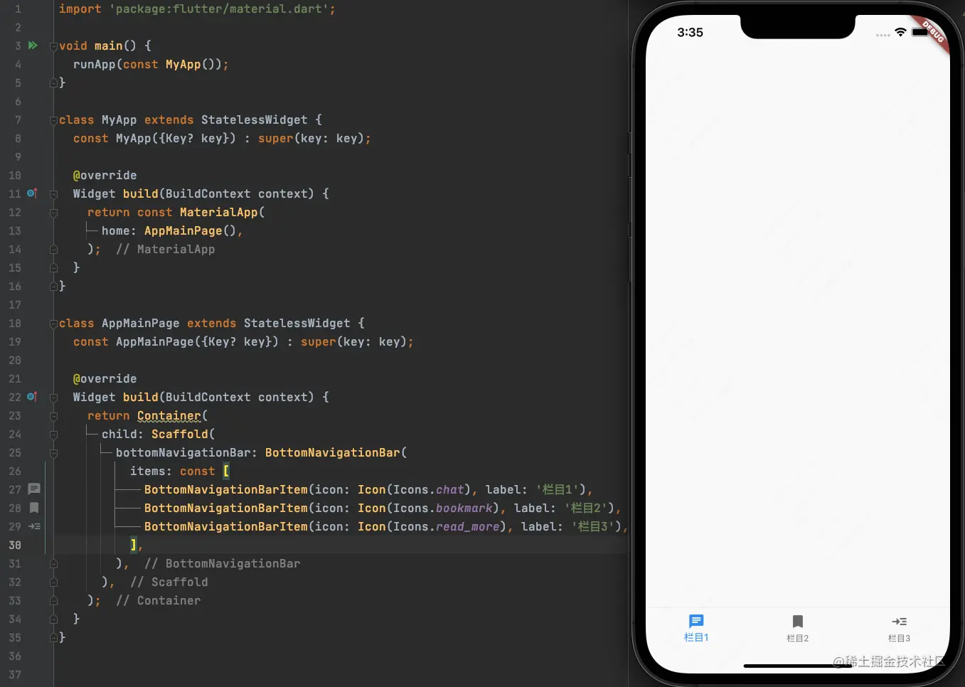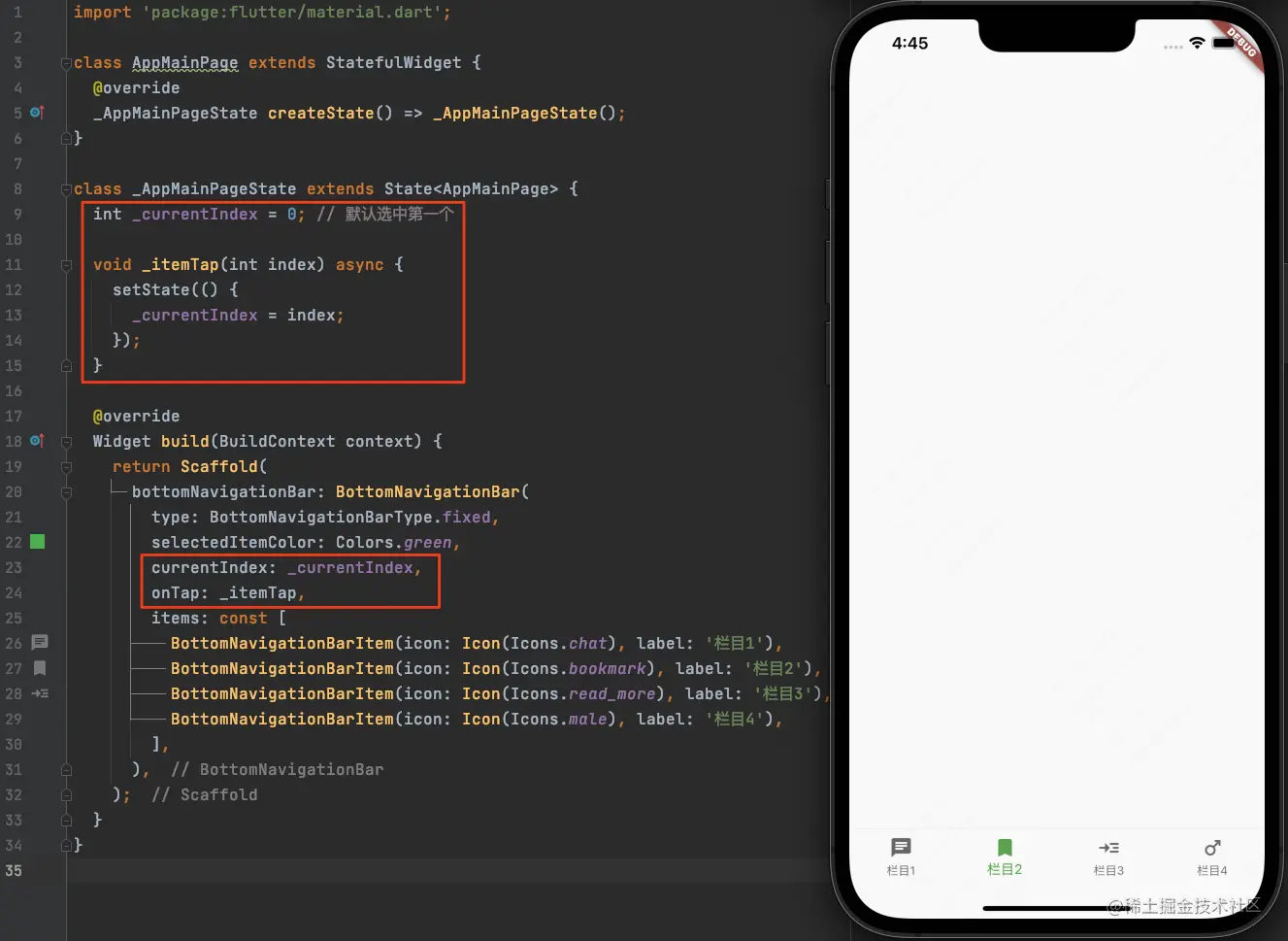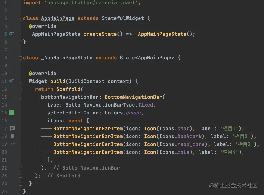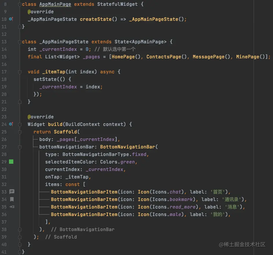 在Item切换之后,颜色也要跟着发生变化,想要实现这种效果,那么就需要用到状态管理,那么我们就需要对当前的代码进行改造: 我们将AppMainPage单独抽出,因为需要进行状态的改变,所以需要用到有状态的Widget,代码调整如下: