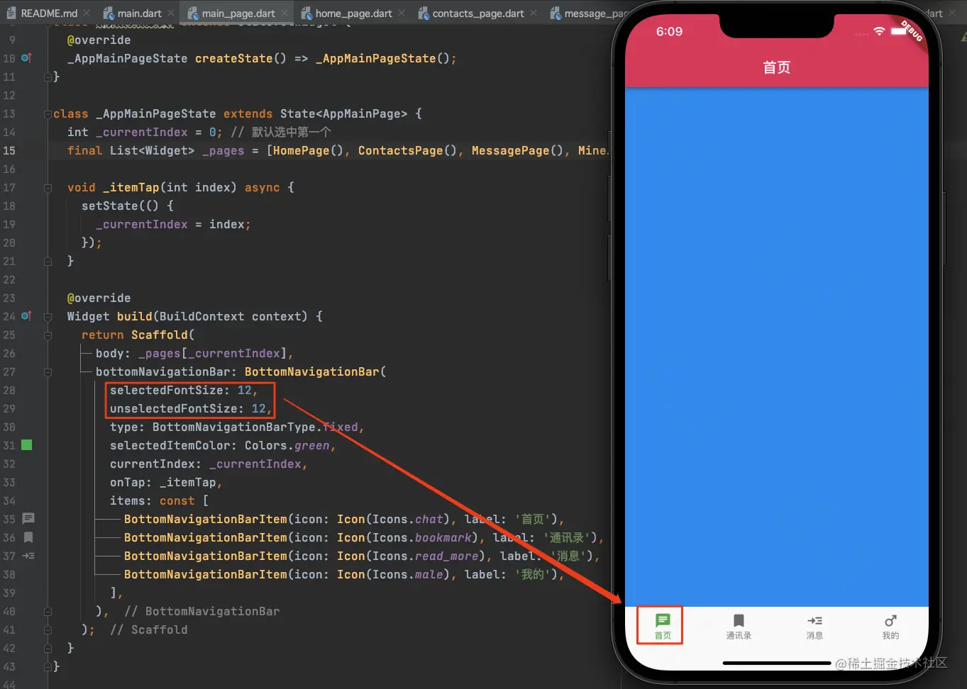 底部导航栏Item被点击时,默认效果文字会被放大,想要取消放大效果,可以通过设置BottomNavigationBar的selectedFontSize和unselectedFontSize两个属性,将选中和未选中时两种状态的文字大小设置为一样大小即可:
