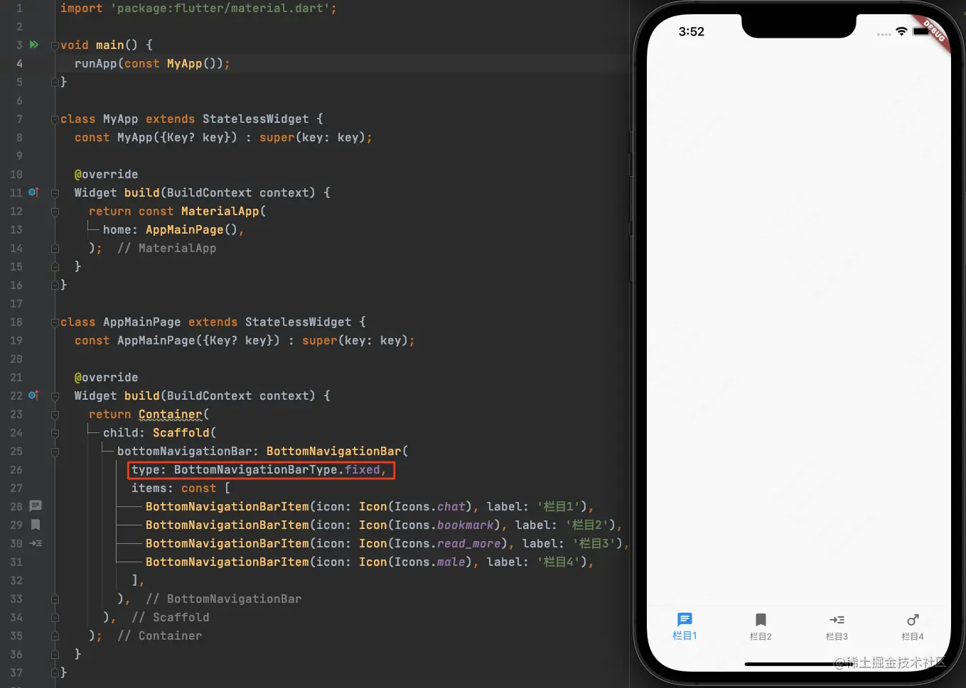 这个时候我们需要设置一下样式的问题,将BottomNavigationBar的type属性设置为BottomNavigationBarType.fixed,效果如下: