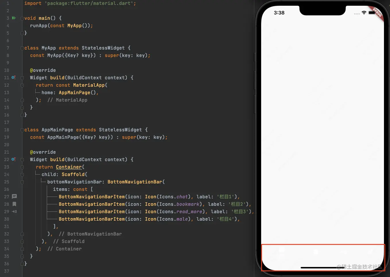 Scaffold中有bottomNavigationBar属性可以设置底部导航栏;BottomNavigationBar中items属性可以设置导航栏BottomNavigationBarItem的数组;