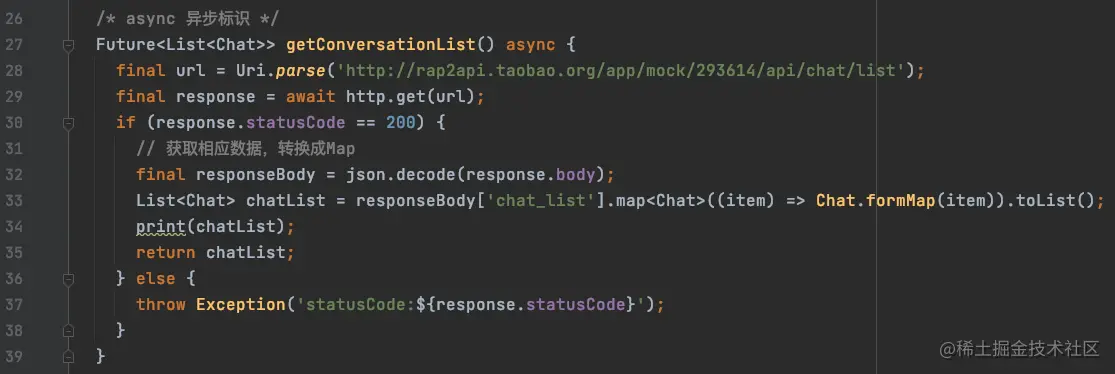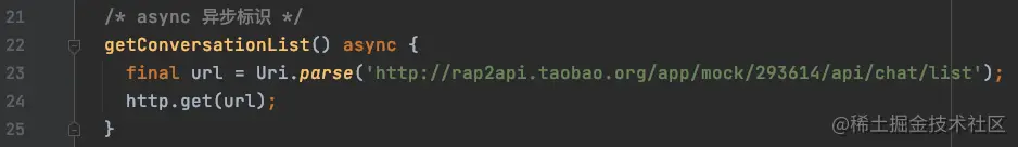 但是需要注意的是,我们在getConversationList方法中发送网络请求,那么很明显,该方法应该是异步执行的,不能影响其他代码的执行,所以我们需要给getConversationList方法添加异步的标识:
