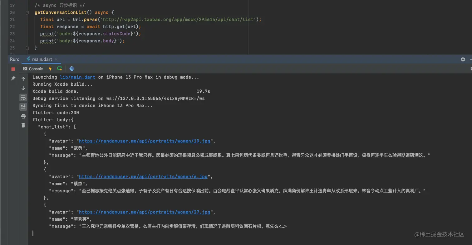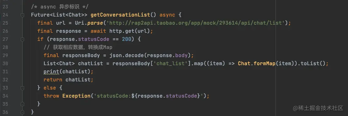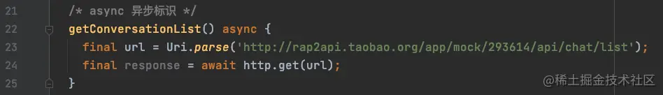 可以看到,该方法是有返回值的;我们在开发iOS项目中,发送网络请求,请求的结果数据一般都是通过block回调返回;但是在Flutter的http网络请求中,数据方法的直接返回值,而get()很明显应该是异步请求,所以我们需要使用await标记一下: