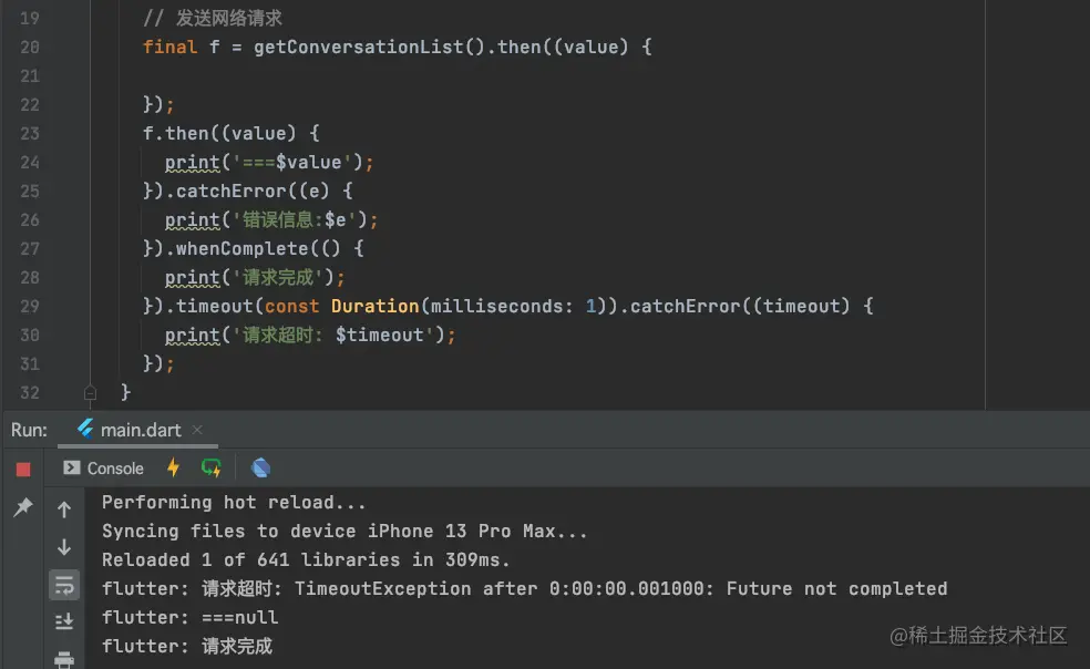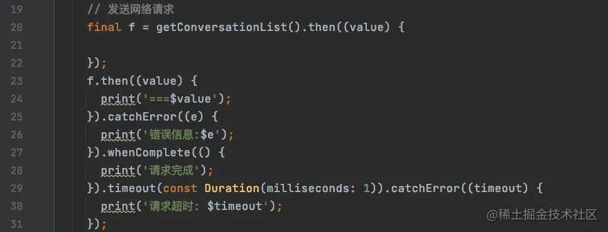 我们发现,即使网络请求超时了,但是then和whenComplete的回调依然执行了,这是因为在Flutter中即使只要网络请求发出,那么就一定会有结果,而结果的状态需要我们自己去控制,比如通过自定义的bool值: