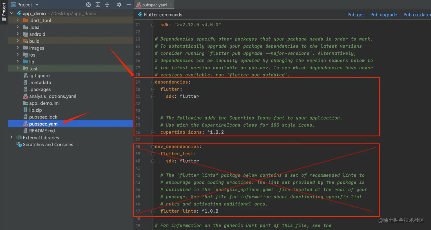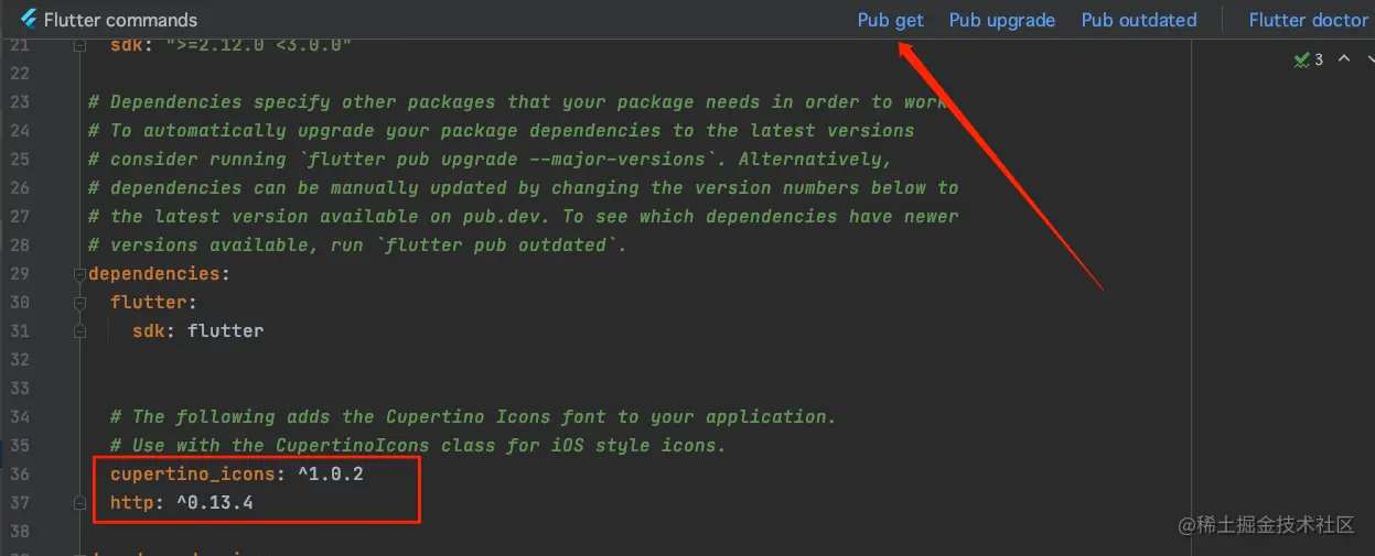 我们发现,在红框区域中,cupertina_icons: ^1.0.2跟我们刚才复制的http: ^0.13.4格式一模一样了;在此处配置的就是我们需要用到的一些库,我们将http的配置信息添加进去,该操作类似iOS中CocoaPods的用法: