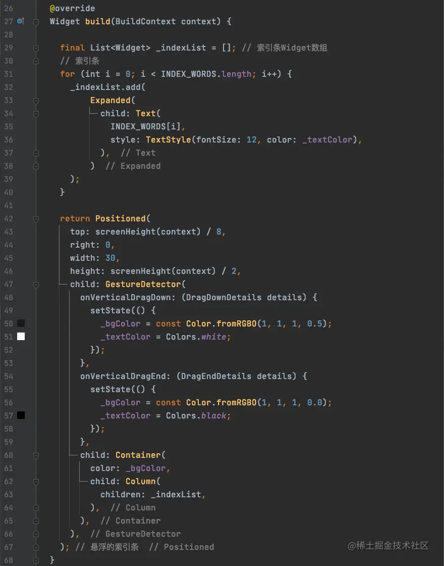 索引条是竖着显示的,那么很明显,需要使用Column进行布局,我们先将Column的children对应的Widget数组创建好: