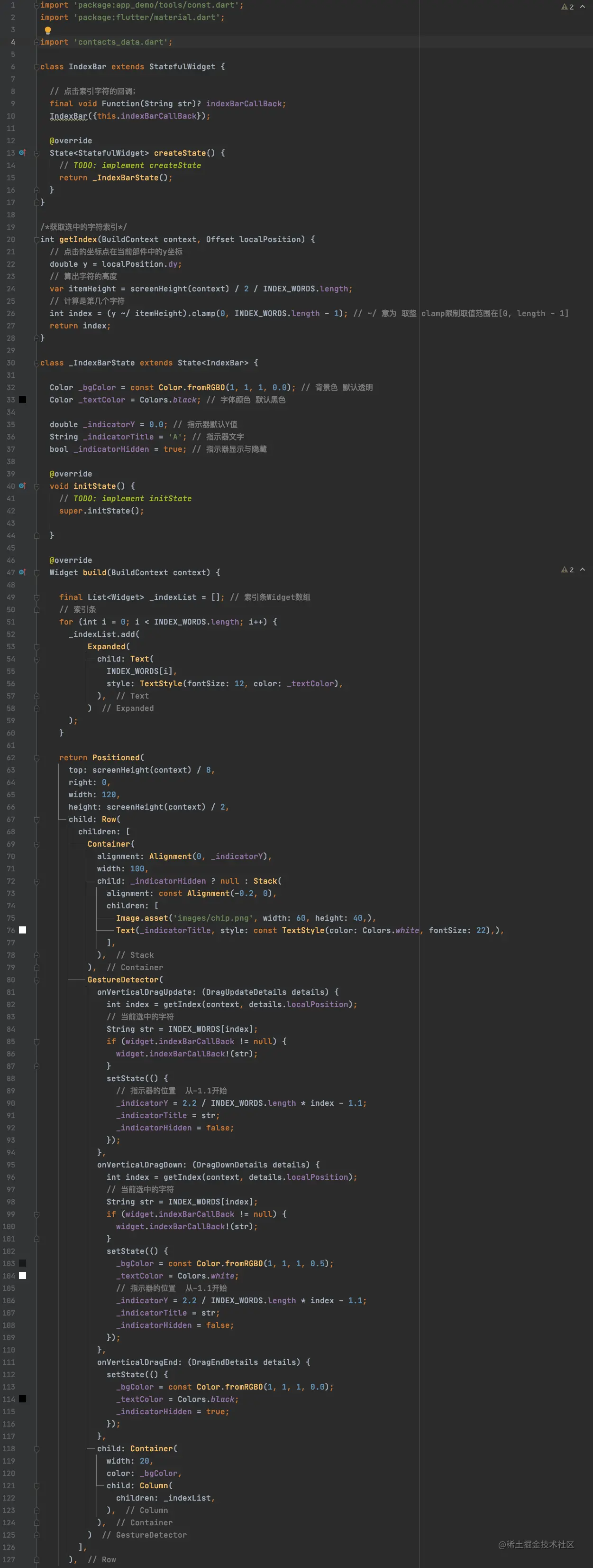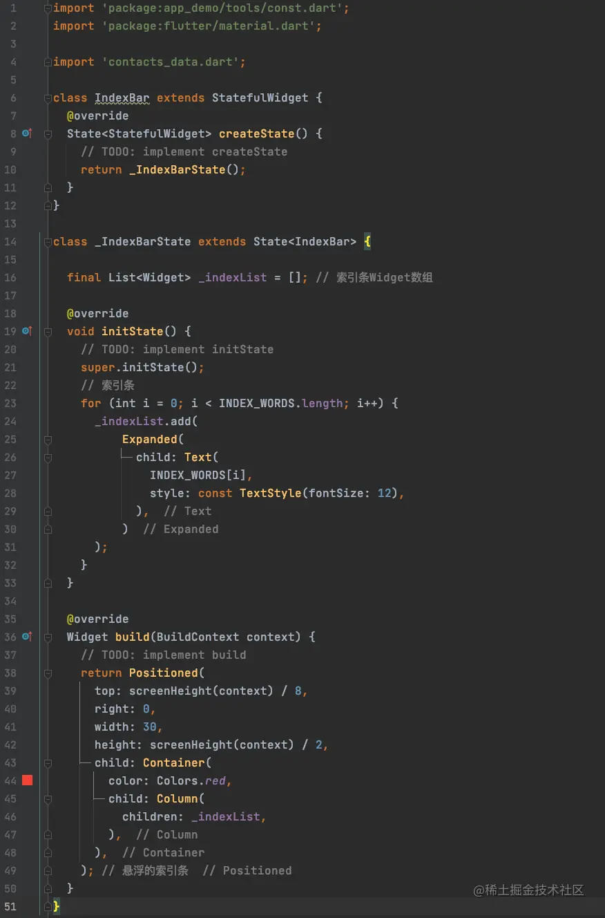 为了便于操作及扩展,我们将索引条抽取出来,放在IndexBar中,完整代码如下: