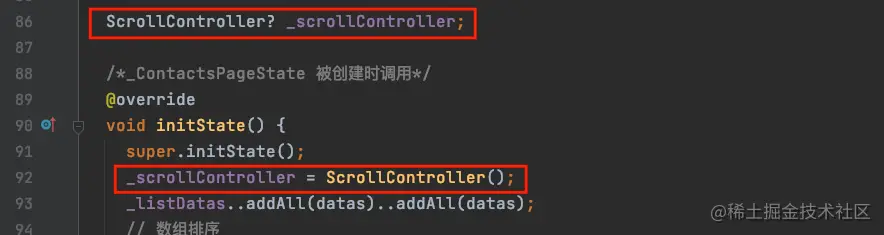 接下来,如果需要ListView同步滚动的话,需要使用到ListView中的属性controller,我们先定义一个_scrollController的属性,然后在initState中初始化: