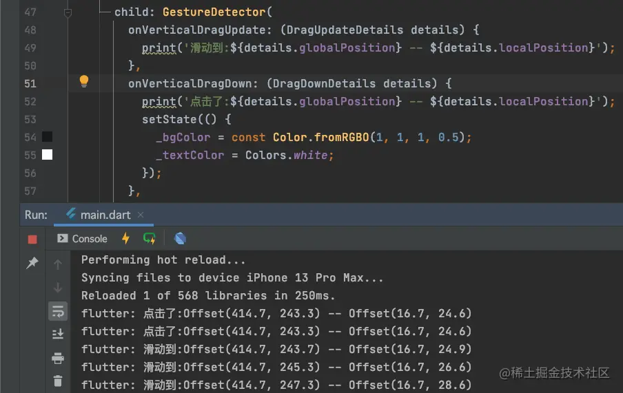 这个时候,我们发现在手势触发时,背景色变了,而字体颜色没有发生改变,这是因为我们字体使用的Text控件的初始化放在了initState方法中,而此方法只有在界面创建时才会调用;setState触发的是build方法,所以我们应该将创建Text的循环过程放在build中进行,最终代码如下: