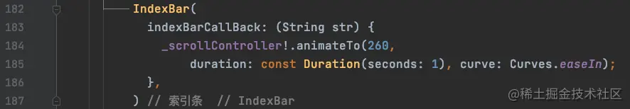 点击索引字符之后,让ListView滚动到260像素的位置,总共动画时长为1秒,Curves.easeIn的意思是动画开始和结束时速度快,中间速度慢;效果如下: