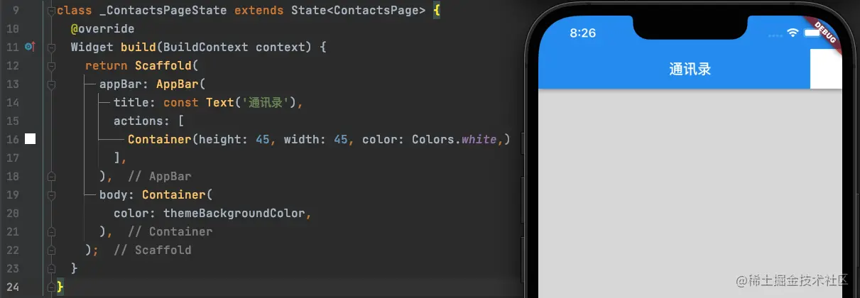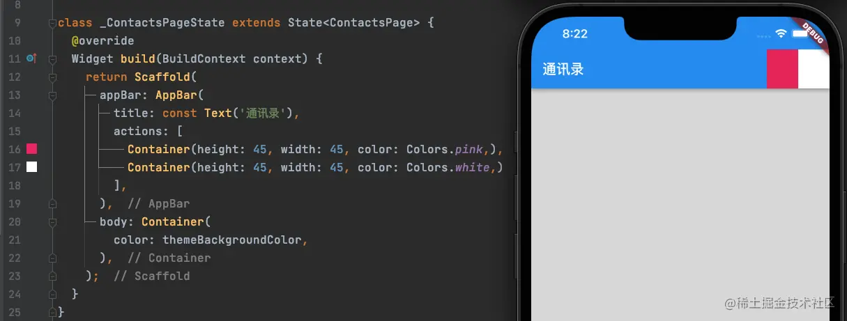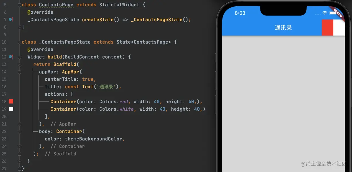 通过定义我们发现,actions属性是一个数组,里边用来存放Widget,那么我们放进去两个简单的Container看一下效果: