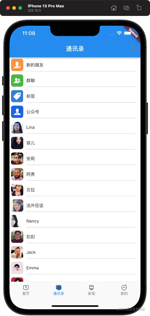 我们在之前的文章中已经学会了如果构建一个ListView,这里搭建联系人列表的过程,就不再赘述,我们直接看初步效果: