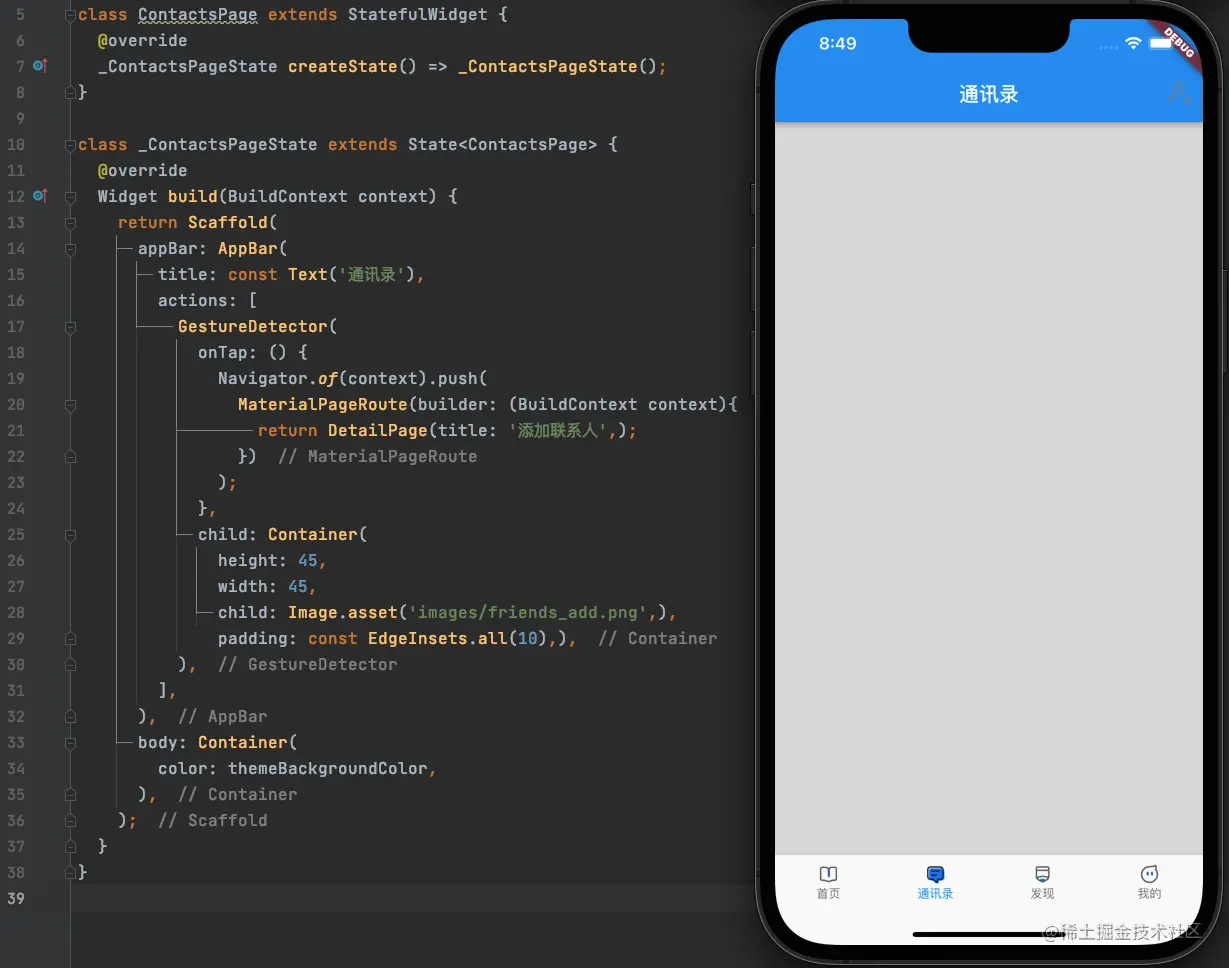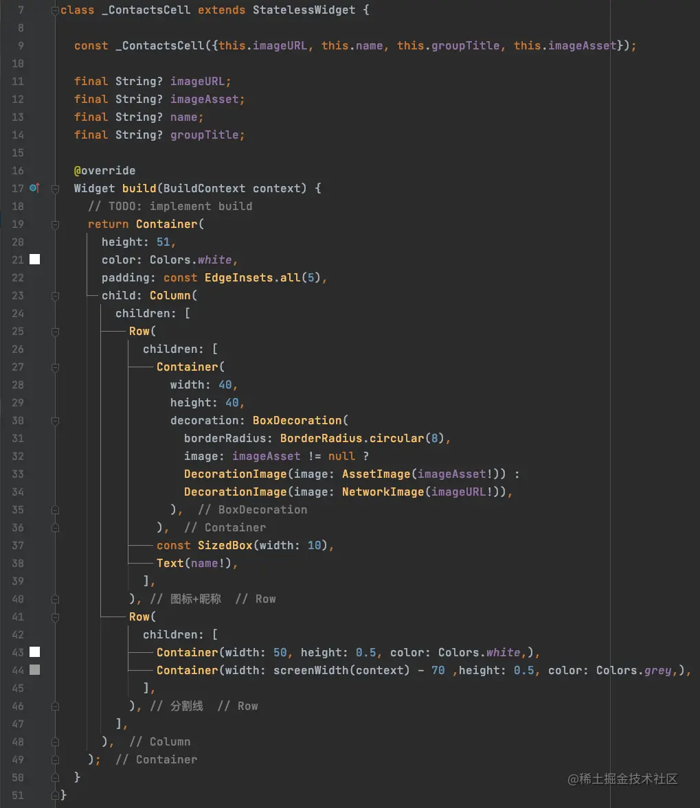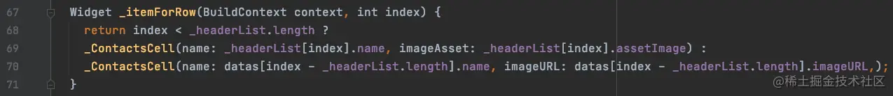 imageAsset不为空,说明是前四条数据,此时需要使用AssetImage显示本地图标;- 否则,就说明是后边的联系人列表数据,就需要我们使用