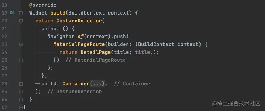 cell的点击事件已经完成了,怎么少得了进行push操作呢?接下来我们演示如果使用Navigator进行push操作;通过push方法的定义,我们知道需要给push方法传递一个Route,在我们Flutter中有一个MaterialPageRoute这样一个现成的Route,我们此处使用它进行操作,其定义如下:
