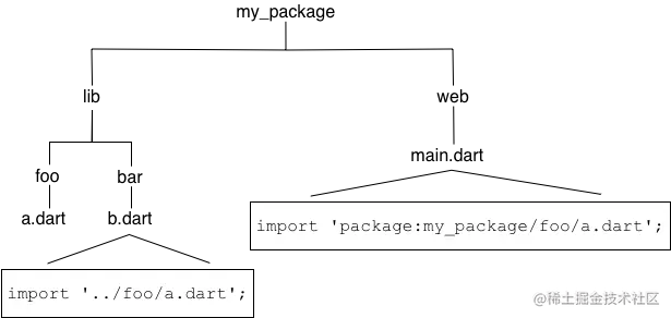 lib/bar/b.dart使用相对 import(import '../foo/a.dart'),但它也可以使用package:指令(import 'package:my_package/foo/a.dart')。