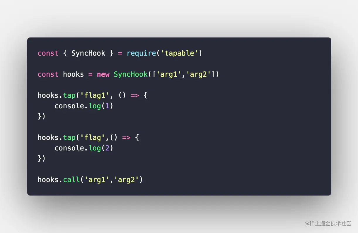 const hooks = new SyncHook(['arg1', 'arg2']);