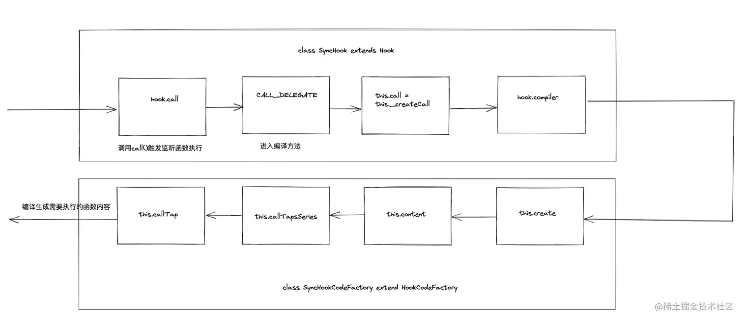 本质上 Tapable 就是通过 Hook(钩) 这个类来保存相应的监听属性和方法,同时在调用 call 方法触发事件时通过 HookCodeFactory 动态编译生成的一个 Function(功能) ,从而执行达到相应的效果。