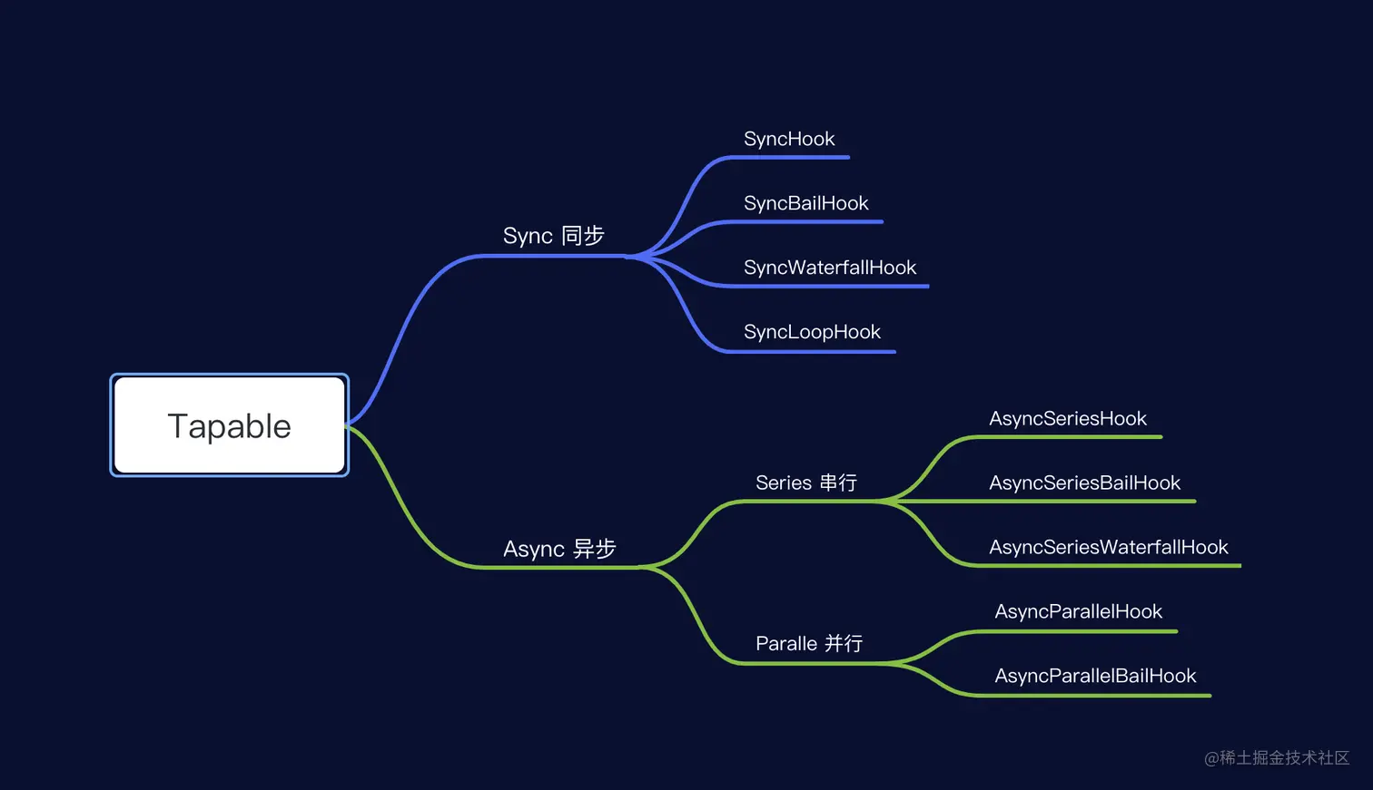 Tapable 可以按照异步 / 同步执行分类的同时也可以按照执行机制进行分类,比如: