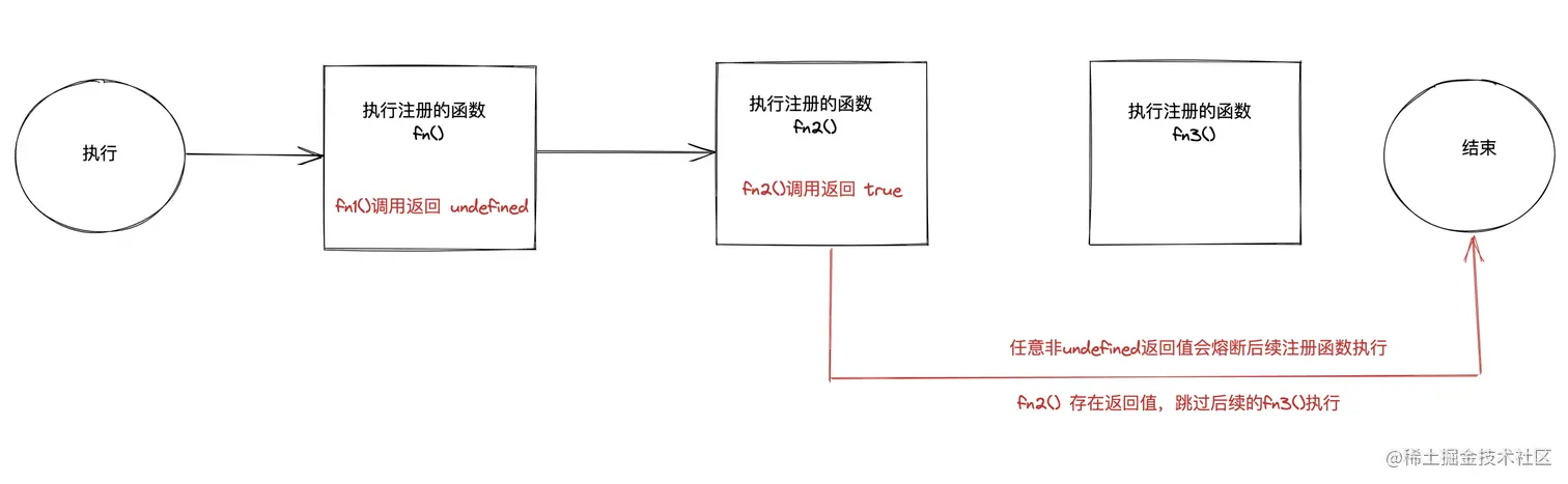 - Bail : 保险类型钩子,保险类型钩子在基础类型钩子上增加了一种保险机制,如果任意一个注册函数执行返回非 undefined 的值,那么整个钩子执行过程会立即中断,之后注册事件函数就不会被调用了。